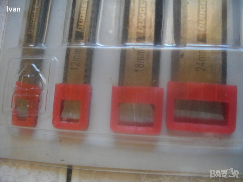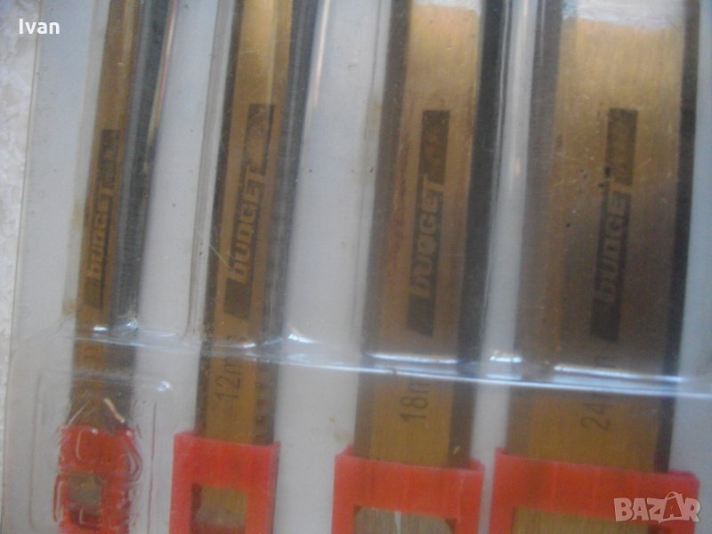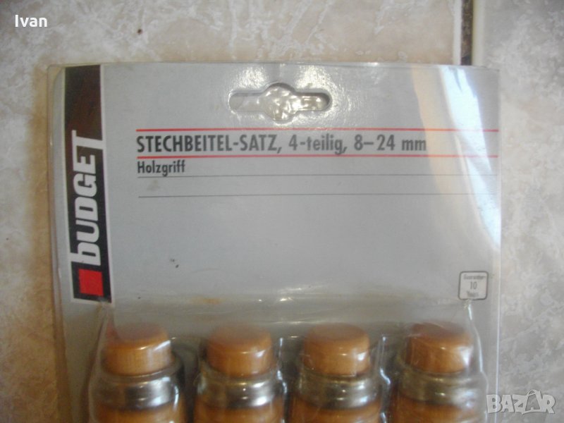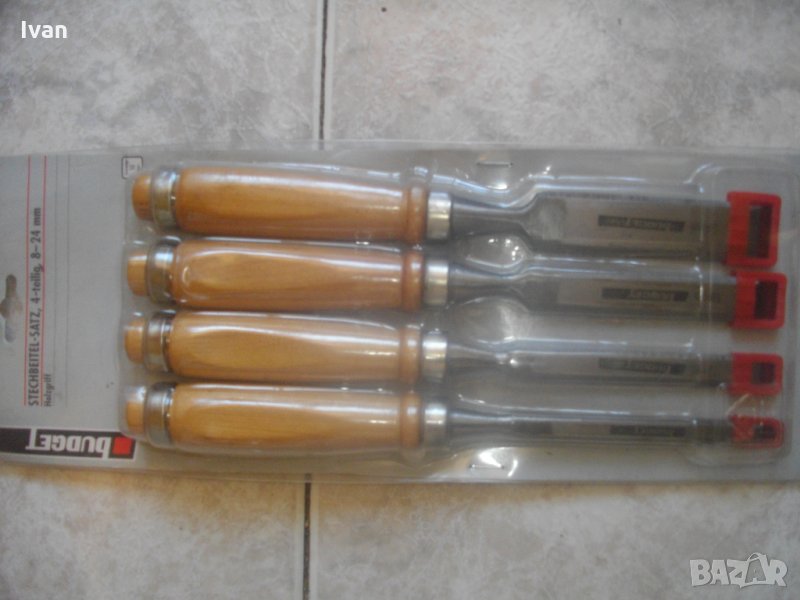 дърводелски длета, високо немско качество - оригинално масивно, здраво и надеждно при работа. Марка на комплекта - Budget. Производство - Germany. Длета - Stechbeitel - Satz, 4 - teilling, 8-24 mm. Размер длета - 8 мм, длето - 12 мм, длето - 18 мм, дбето - 24 мм. Нкалон на заточване - 10 мм.Пристягащи масивни метални пръстени на дръжката. Дръжка - масивна дървена - дрян.наличие на фирмено лого на всяко длето. Длетата са в оригиналната си немска опаковка. Вписано 10 години гаранция за длетата, което показва високото качество на комплекта. Цялостна дължина на длето - 250 мм, работна част - 95мм, коато подлежи на заточване.