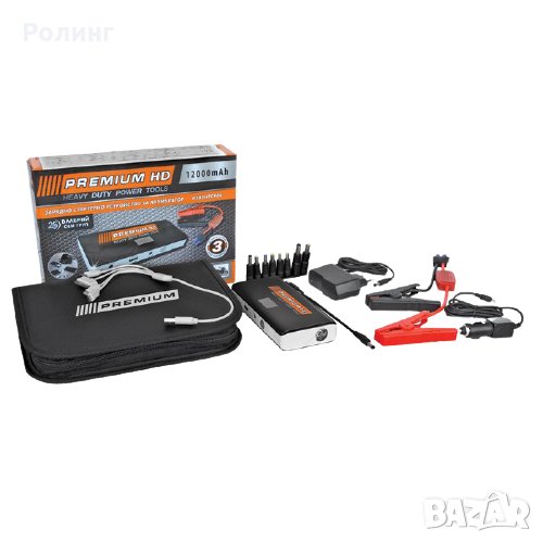 Стартерно за акумулатор PREMIUM е предназначен за лесно запалване на кола при разреден акумулатор и студено време. Същевременно устройството служи и за зареждане на телефони, смартфони, таблети, лаптопи и др. Уредът е много лесен за употреба и е с малки размери, с вграден мощен LED фенер. Този уред ще се изключи автоматично, когато зареждането е завършено. Ще можете да заредите мобилния си телефон с този уред до 6 пъти за Iphone 4 пъти за мобилен телефон. С този уред ще можете да заредите мобилния си телефон за 1 час. Това зарядно може да захранва вашия лаптоп 2-3 часа, може да запали автомобила ви при пълен заряд приблизително 20