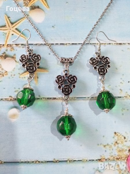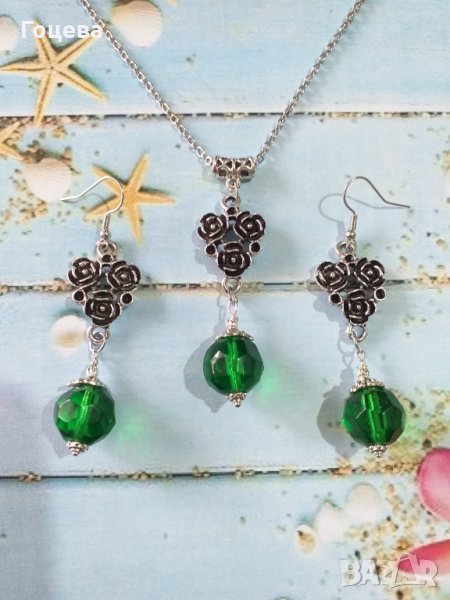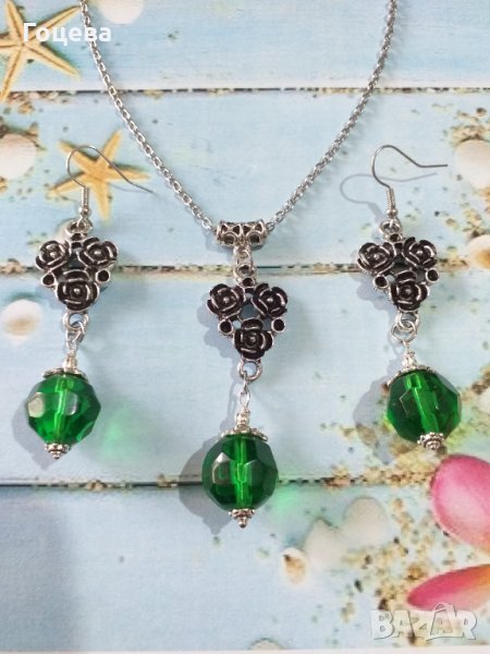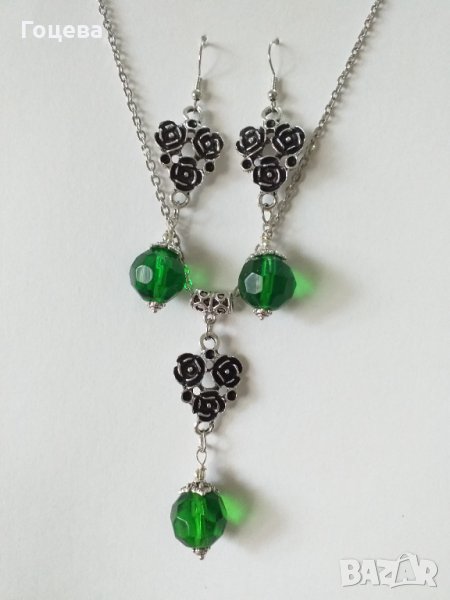 Разкошен комплект бижута във Викториански стил със зелени кристали и основа с рози в цвят сребро → Обява 33854593