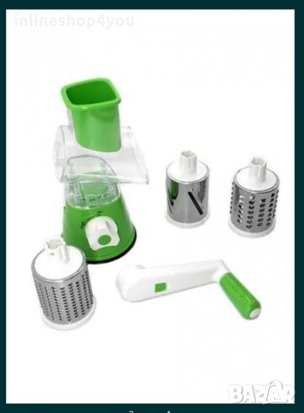 Уредът се разглобява лесно на : корпус, барабан със сменяеми рендета, ръчка и отвор за пробутване на продуктите.