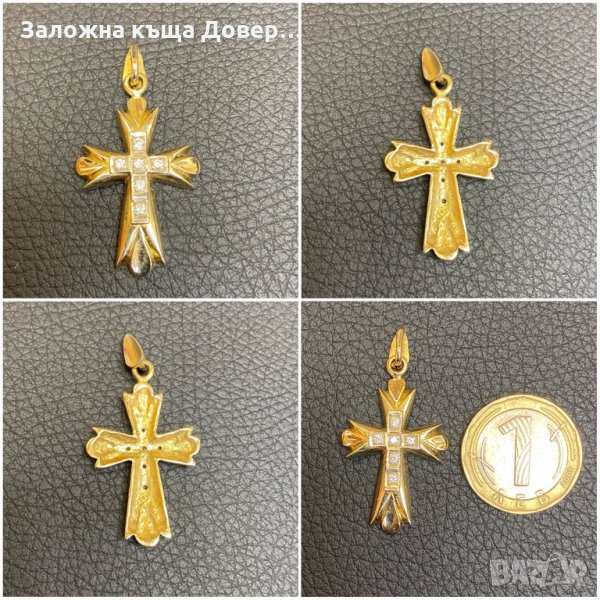 продаден Кръст с инкрустирани кристали изработен от 14 каратово злато с проба 585.Перфектно състояние. Никакви забележки,без следи от носене.Почистен и полиран в професионално златарско ателие и покрива всички изисквания за чисто ново изделие.Издаваме сертификат.
