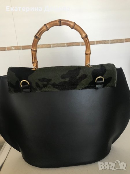 Красива чанта с декорация в тъмно зелено и черно анималистичен принт и кокалена дръжка. Естествена кожа и заоблен дизайн.