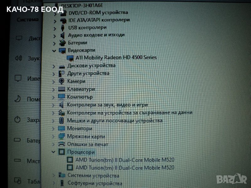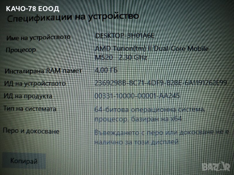 Процесор: AMD Turion(tm) II Dual-Core Mobile M520, Clockspeed: 2.3 GHz, Cores: 2 Threads: 2, Typical TDP: 35 W;