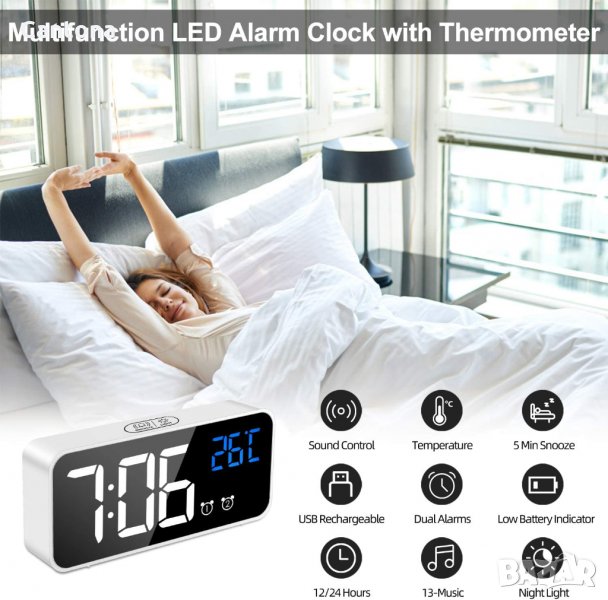 LED будилник, температура, акумулатор, Snooze, регулируема сила на звука и яркост, 13 мелодии
