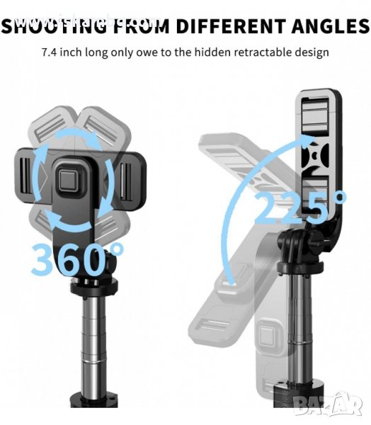 Този лек, удобен и лесен за употреба селфи / статив с блутут дистанционно е перфектното допълнение към вашия мобилен телефон. С негова помощ можете лесно да снимате видео или снимки с телефона си от разстояние до 10 м без да трябва да активирате таймера на телефона. Захванатия телефон може да бъде завъртян до 270° за да намерите перфектния ъгъл на заснемане. Телескопичната дръжка с дължина от 19.5 до 70 см ви позволява да правите впечатляващи селфита или снимки на цялата компания. Високо качество на материалите и изработката.