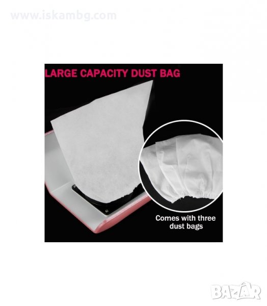 Прахоуловителят се поставя директно върху масата за маникюр, за да дърпа прахта, преди тя да има шанс да се разпръсне във въздуха. Мощният вентилатор на уреда улавя прахта веднага след като тя се генерира, като го държи далеч от лицето ви и зоната на дишане. В комплекта има три торби които могат да се перат и да се подменят за да се ползват повторно, така че да не се налага да купувате нови.