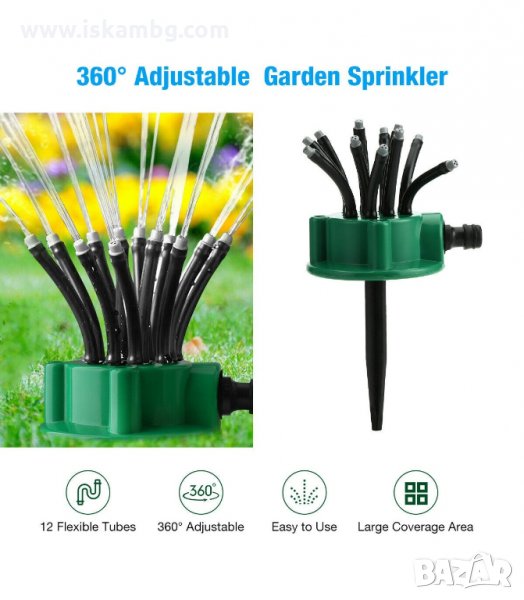 Желаете да улесните начина, по който напоявате вашите тревни площи? Писнало Ви е да си губите няколко часа в поливане? Имаме Potrebno-то решение на проблема – Гъвкава 360 градусова пръскачка за поливане. С нея това занимание се превръща в удоволствие. Изработена от здрава ABS основа и PVC маркуч, която може да се използва постоянно. Иновативният дизайн на главата с 12 регулируеми дюзи за маркуч, всяка от които има 3 отделни отвора.