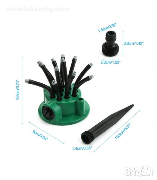 Иновативна пръскачка за тревни площи и градина, подходяща за вилата или къщата. Благодарение на 360 градусовият обхват уреда е идеален за поливане на малки площи и градини, както и за декоративни растения. Уреда има 12 издадени дюзи, който могат да се позиционират по желан от вас начин. Така напояването е по-лесно. В зависимост от налягането на водата се определя и площта на напояване.