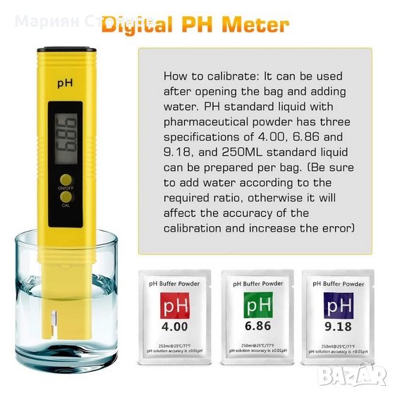 калибриране с 3 буферни праха. Фабрично калибрират готов за употреба;