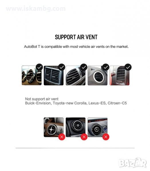 Универсален за всички мобилни телефони и е изключително практичен за използване. Захваща се много бързо и лесно за въздуховода на парното и може да се монтира/демонтира за секунди.