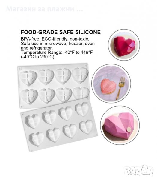 Силиконов молд във формата на диамантено сърце. С тази форма ще впечатлите вашите гости с невероятно вкусен домашно приготвен десерт, който изглежда като току що излязъл от бутикова сладкарница. Подходяща за приготвяне на кексове, сладкиши, пудинг, желета и други десерти. Издържа на температура от – 40 до 230 градуса.