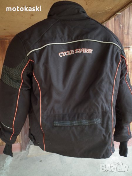 Детско яке за мотор Cycle Spirit, протектори на гръб, лакът и рамо (гръбният липсва), размер L, дължина отзад 62 см., обиколка около 108, гръб 45, ръкав отгоре 53 и отдолу 41, има махаща се подплата и цип за скачване с панталон, цена: 89 лв.