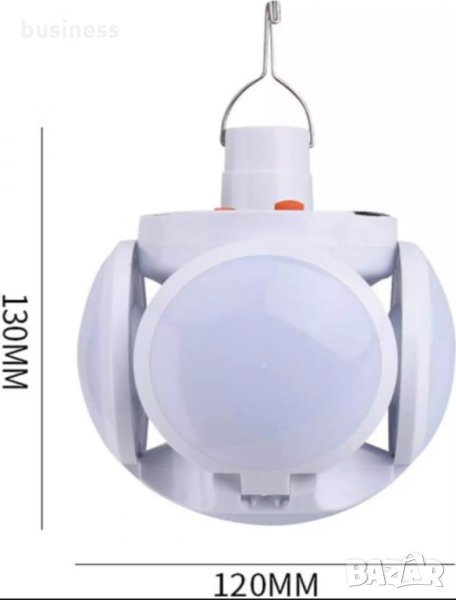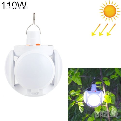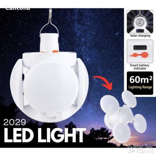 ФУТУРИСТИЧНА LED лампа с форма на футболна топка, студена бяла LED светлина соларен панел от горния край, сгъваема лампа с 4 панела, универсална лампа подходяща както за дома, така и за работилници, лаборатории, читални, хамбари, складове, мазета. Кука за закачане