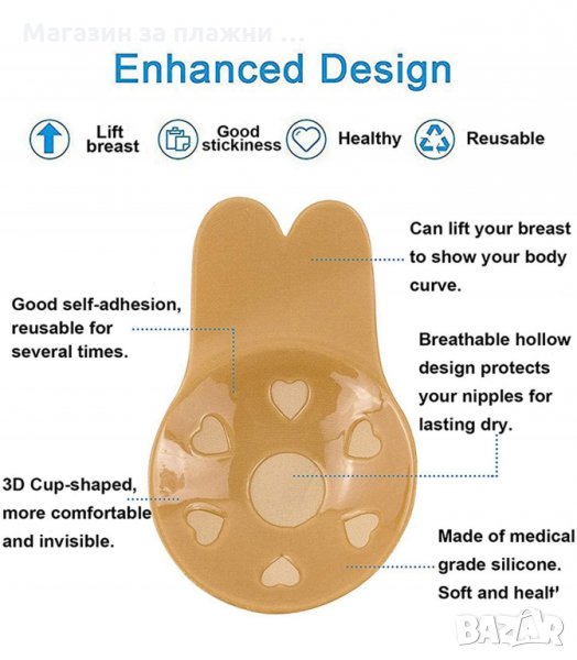 Сутиенът с повдигащ ефект се състои от две отделни чашки, които не са свързани по между си. Изработени са от медицински силикон. Материята е дишаща и нежна към кожата. Няма презрамки и колан. Чашките са гладки и не се забелязват под дрехите. Дизайнът им е изчистен. Над чашката има част, която е предназначена за залепяне и коригиране на повдигането.
