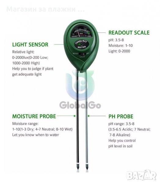 Този 3-в-1 измервател на влага, pH и светлина в почвата е проектиран, както за вътрешна така и за външна употреба, за да се следи по-доброто състоянието на вашето растение. Той ви помага да контролирате стойността на pH в почвата, влажността (кога трябва да поливате растението или да не го правите), а също така да знаете дали то получава достатъчно слънчева светлина. Идеален инструмент за любители на растенията, за да ги поддържате по-здрави. Отчитането става бързо и лесно, не се нуждае от захранване с батерии.