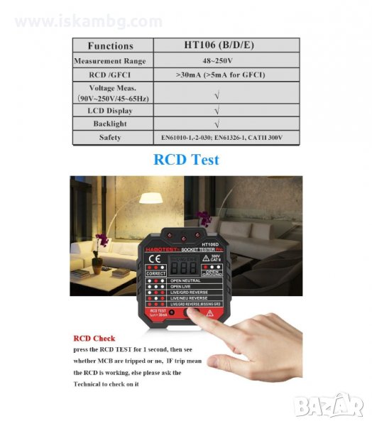 Цялата електрическа инсталация може да бъде тествана чрез просто свързване на устройството към контакта и проверка на дисплея и светлините.