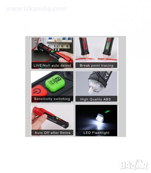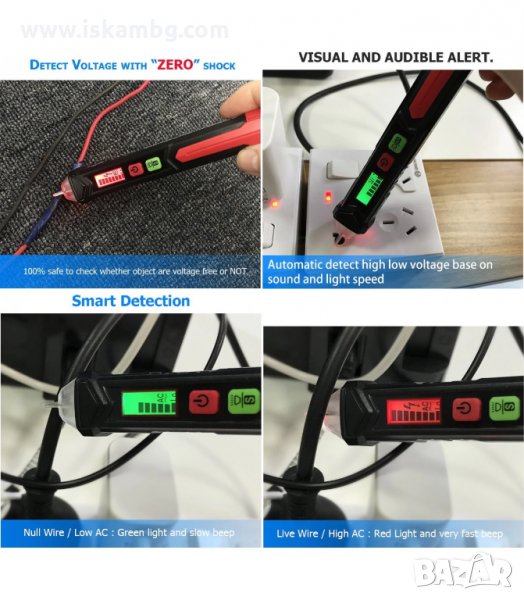 Индикация с деления на LED екран, който свети в зелено при нормални стойности и в червено при високи. Налична звукова индикация. Може да откривате бе проблем кабели в стени, да разпознавате фазата от нулата. Не е нужно да обелвате кабела, както е при обикновените фазомери.