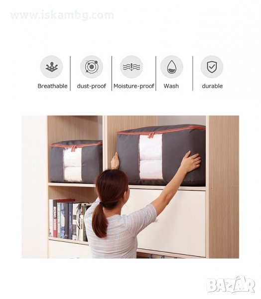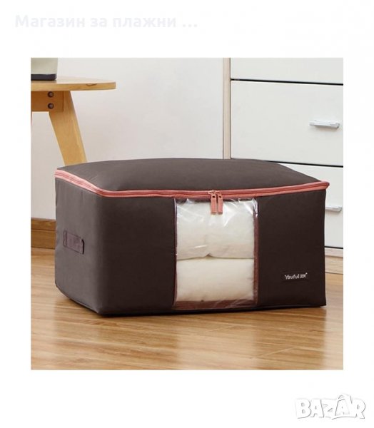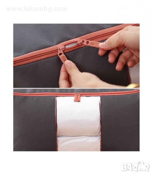 Калъф за съхранение на одеяла, дрехи или други вещи в гардероба или под леглото. Органайзера е идеален както за съхранение на дрехи, спално бельо и завивки извън сезона им, така и за пренасянето им по време на ваканции и др. Не позволява навлизането на мухъл и в същото време осигурява достъпа на на свеж въздух.