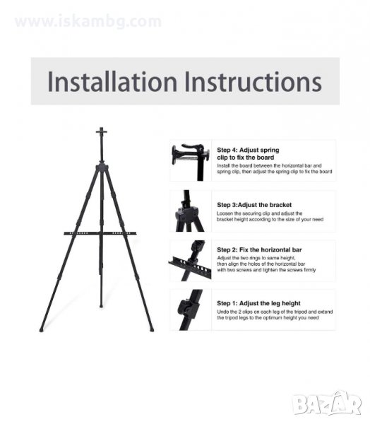 Максималната височина на платното за рисуване което може да сложите на статив Нант е 80 сантиметра. Той е в комплект с удобна черна чанта с цип и каишка за улеснено транспортиране. Благодарение на телескопичните си крака статив Нант е подходящ и за работа на маса.