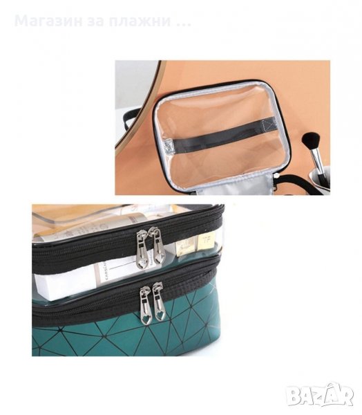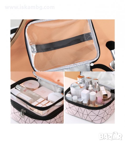 Нямате ли достатъчно място във вашата козметична чанта? Тази чанта има два етажа, така че проблемът ви е решен ! Можете да съхранявате козметика и козметични инструменти. Горната част е ефектно прозрачна, подходяща със стабилно закопчаване с двоен цип. С удобна дръжка за пренасяне. Устойчивата форма позволява да наредите козметичните шишенца и бурканчета.