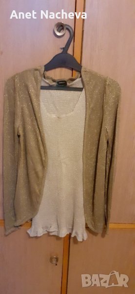 Жакет, дамски ,бежов с ламе, без копчета и плетена без ръкави блуза, снимка 1 - Блузи с дълъг ръкав и пуловери - 33901626 Жакет, дамски ,бежов с ламе, без копчета и плетена без ръкави блуза, снимка 2 - Блузи с дълъг ръкав и пуловери - 33901626 Жакет, дамски ,бежов с ламе, без копчета и плетена без ръкави блуза, снимка 3 - Блузи с дълъг ръкав и пуловери - 33901626 1/3