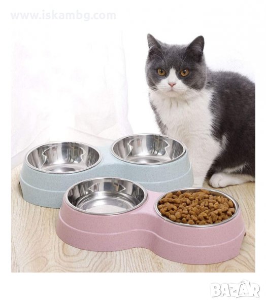Модерна двойна купа за храна за котки, с 2 съда от стомана.Двойната купичка за хранене е отличен избор за изтънчените стопани и стопанки, които се отличават с функционалност и стил.