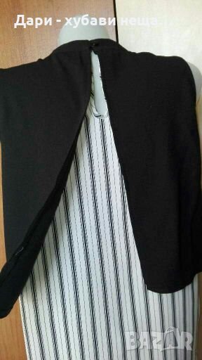 Двупластова блуза, като черната част е с лек релеф.Бялата част е по-тънък плат, който пада тежко.Без хартиен етикет, материя полиестер.Дрехата няма еластичност.Подходяща е за дами, носещи 38(М) р-р, или най-много M/L.
