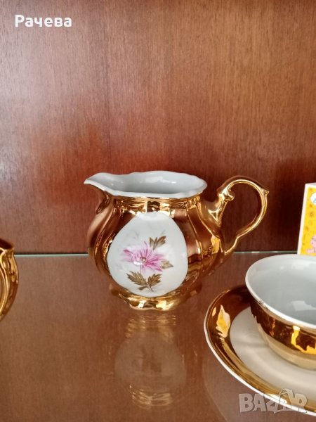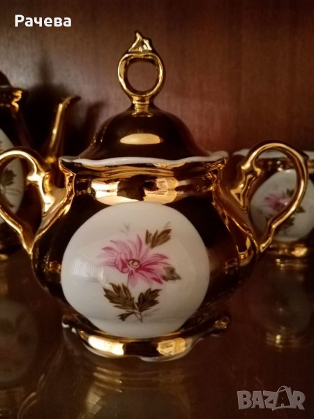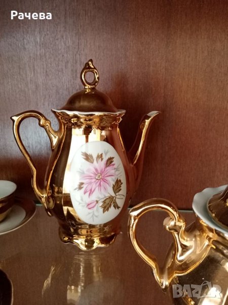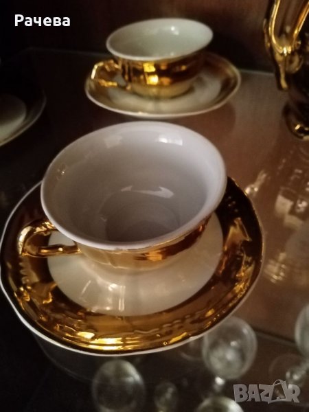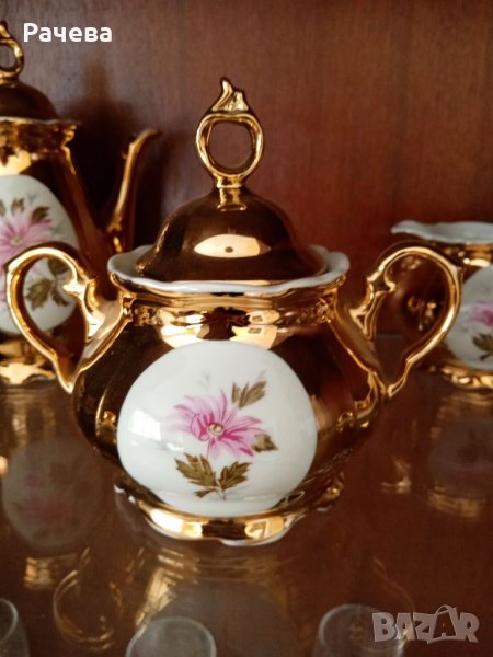 Много стар, но не е използван пълен комплект. Кана, Захарница, малка каничка, 6 чаши с чиниики. Цялостна позлата. Стоял е през всички години във витрина.
