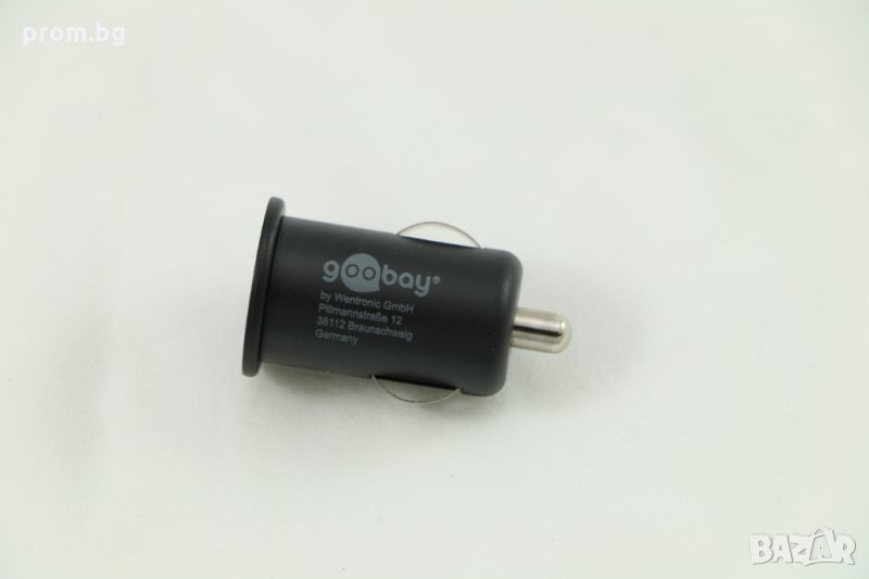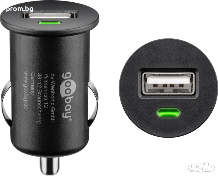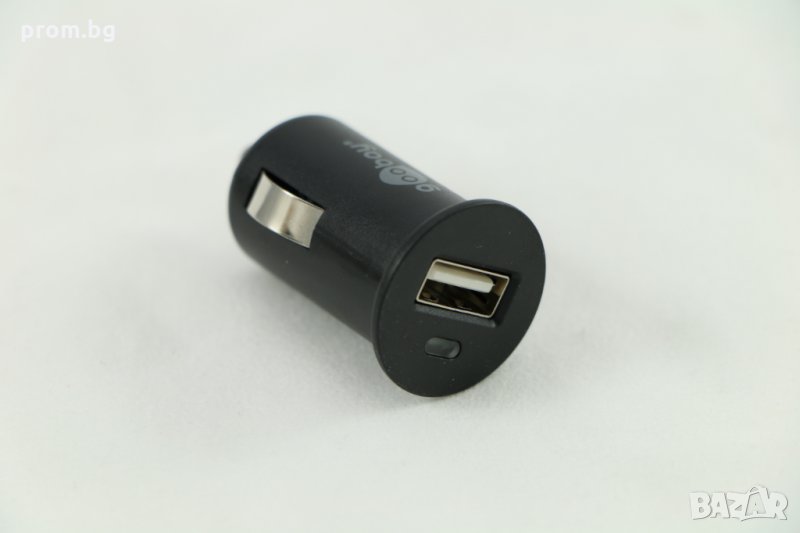 Автомобилен адаптер (зарядно) за захранване USB A 1A. Ново, внос от Германия Goobay, немско. 5V / 1A USB изход и контролен светодиод. С индикация за свързване на USB устройството (зелен светодиод). Размери: 44,4 x Ø 25,2 mm. Параметри: 12/24 V DC, max. 520 mA.