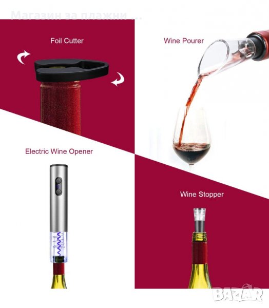 Електрически тирбушон за вино - комплект 4 части е предназначен за отваряне на всички традиционни бутилки за вино. Лесен за работа, премахва тапата за секунди само чрез натискането на бутон. Изработен е от висококачествена PVC пластмаса. Спираловидният механизъм е обграден с прозрачна обвивка и му придава стилен и модерен дизайн. Работи на батерии, което го прави идеален за пестене на енергия и опазване на околната среда. Комплектът за вино е поставен в красива подаръчна кутия и е готов подарък за всеки любител на виното.