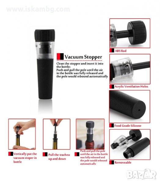 Вакуумна тапа - ще държи виното в отворената бутилка до следващия път. Тапата създава вакуум чрез изпомпване на въздух от бутилката, като я предпазва от окисляване и запазва виното.
