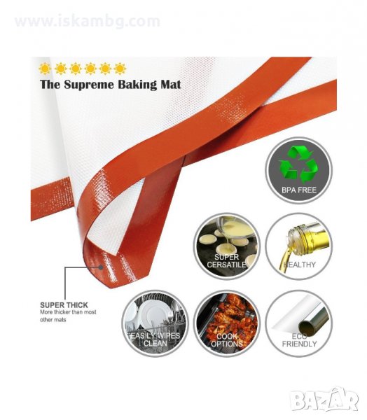 Устойчив, незалепващ и безопасен материал - изработени от 100% безопасен за здравето фибростъклен плат с покритие от термо-устойчив силикон за печене. Специален, незалепващ силикон предназначен за използване с храни. Подложката може да бъде използвана при температури от -40 до 230 градуса по целзий.