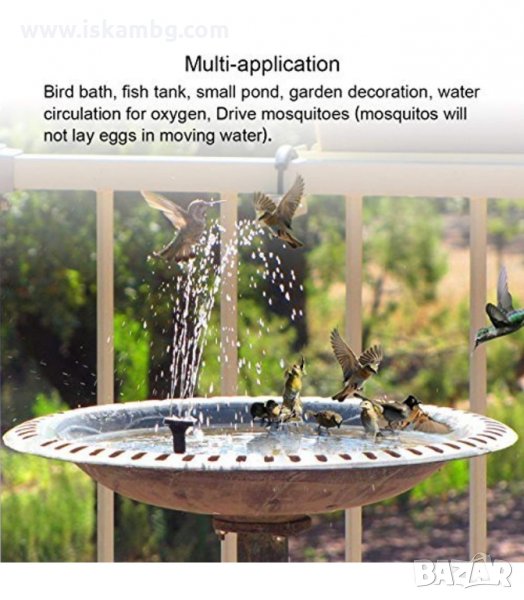 Изцяло съобразен с природата продукт, състоящ се от кръгъл соларен панел и захранвана автоматично от него помпичка посредством слънчевата енергия. Към помпичката се прикрепя накрайник, с помощта на който водата се разпръсква под различна форма и с различна височина на струята (между 30 и 60 см.). В комплекта са включени три модела накрайници и две приставки-удължители за накрайниците за разпръскване на струята вода.