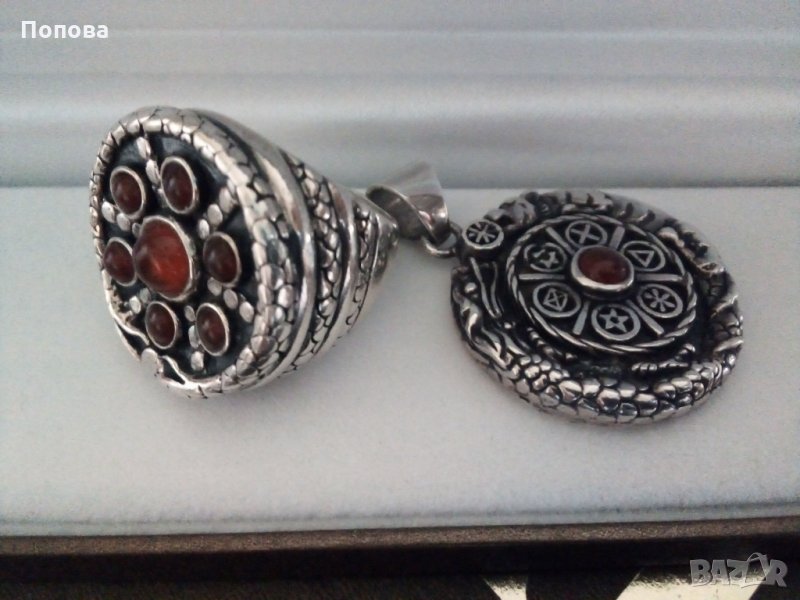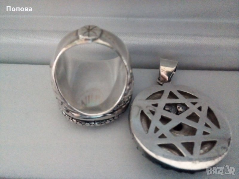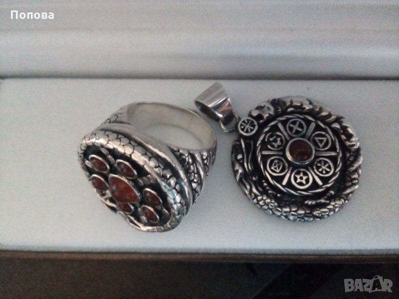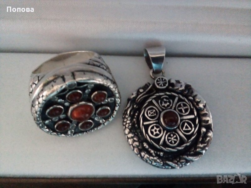 Уникални и единствени по рода си бижута. Перфектна ръчна изработка. Масивно сребро 925 с естествен карнеол. Впечатляващи на живо. Огромен и обемен пръстен с корона 2,5 см., халка 18 мм.. Медальон двустранен с пентаграм на гърба,4 на 3 см., заедно с халката. Отлично състояние. Бижута без аналог.Цената е без коментар.Не разделям комплекта.