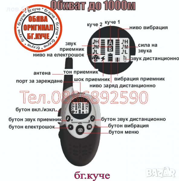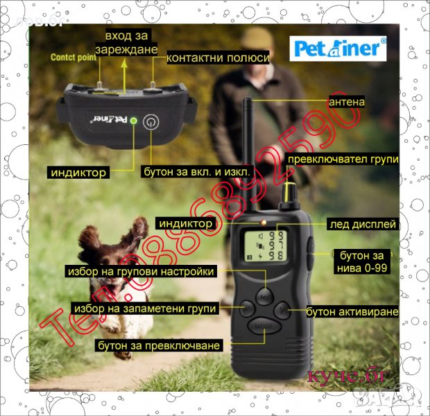 - обхвата между дистанционното и нашийника е до 350 метра , като на открита площ без дървета и храсти може да достигне максимален обхват.