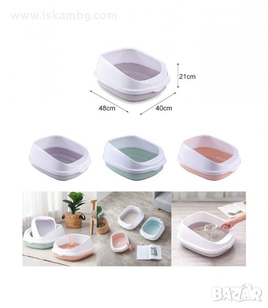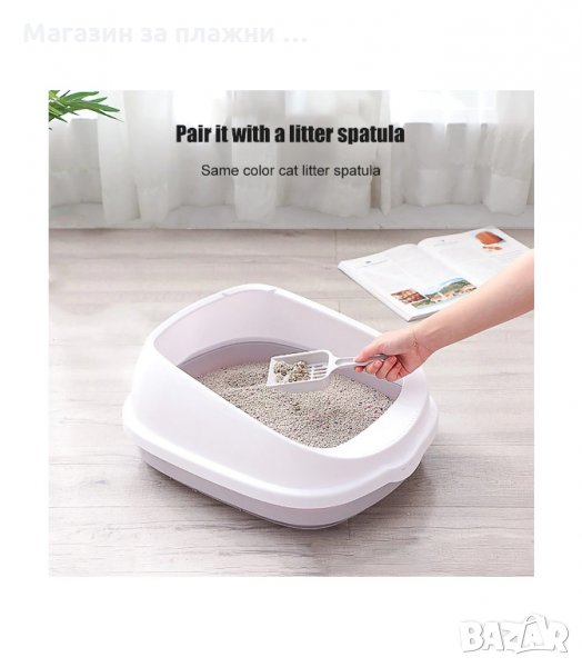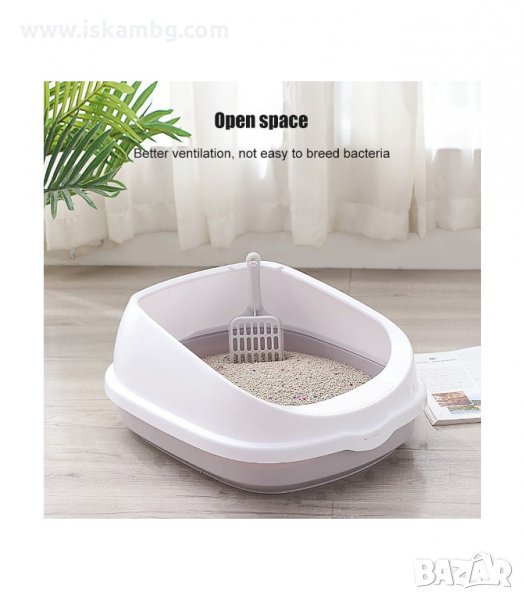 Котешка тоалетна с борд и модерен дизайн. Високия борд задържа поселката и урината вътре в тоалетната. Нисък вход за лесен достъп. Заедно с котешката тоалетна получавате и лопатка/сито, която се закрепва за самия леген