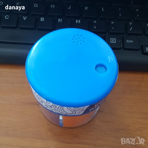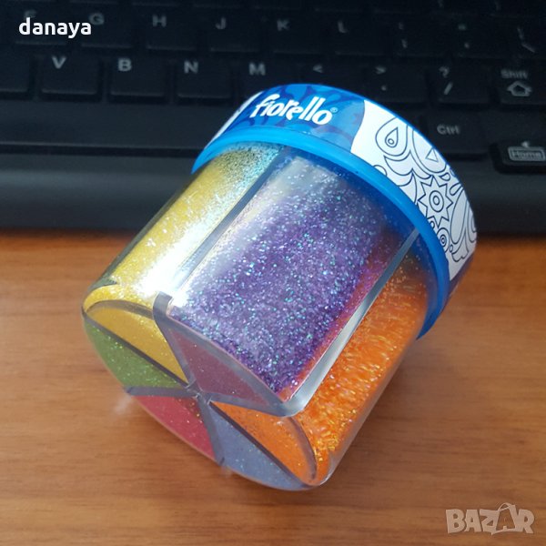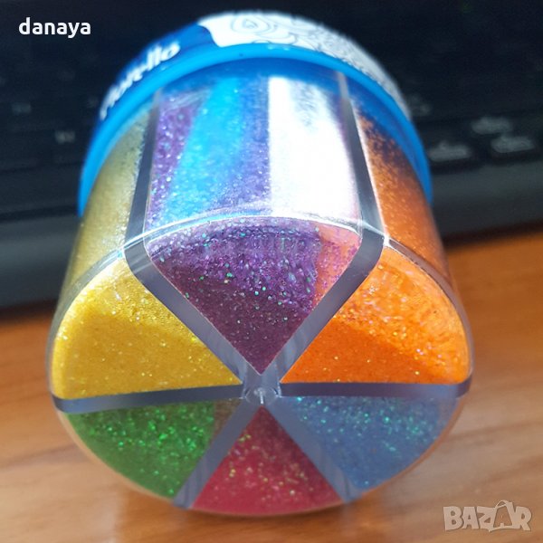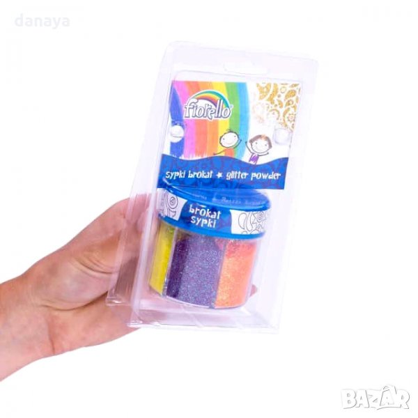 Цветен брокат в бурканче, разделено на 6 секции. Във всяко отделение има различен цвят – жълт, лилав, оранжев, син, червен, зелен. Избора на цвят става много лесно чрез въртене на капачето. Цветният брокат е подходящ за декориране на картички, украса на различни изработки и др. Може да се прилага върху различни повърхности, които са намазани с лепило, лак или боя (преди да са изсъхнали).
