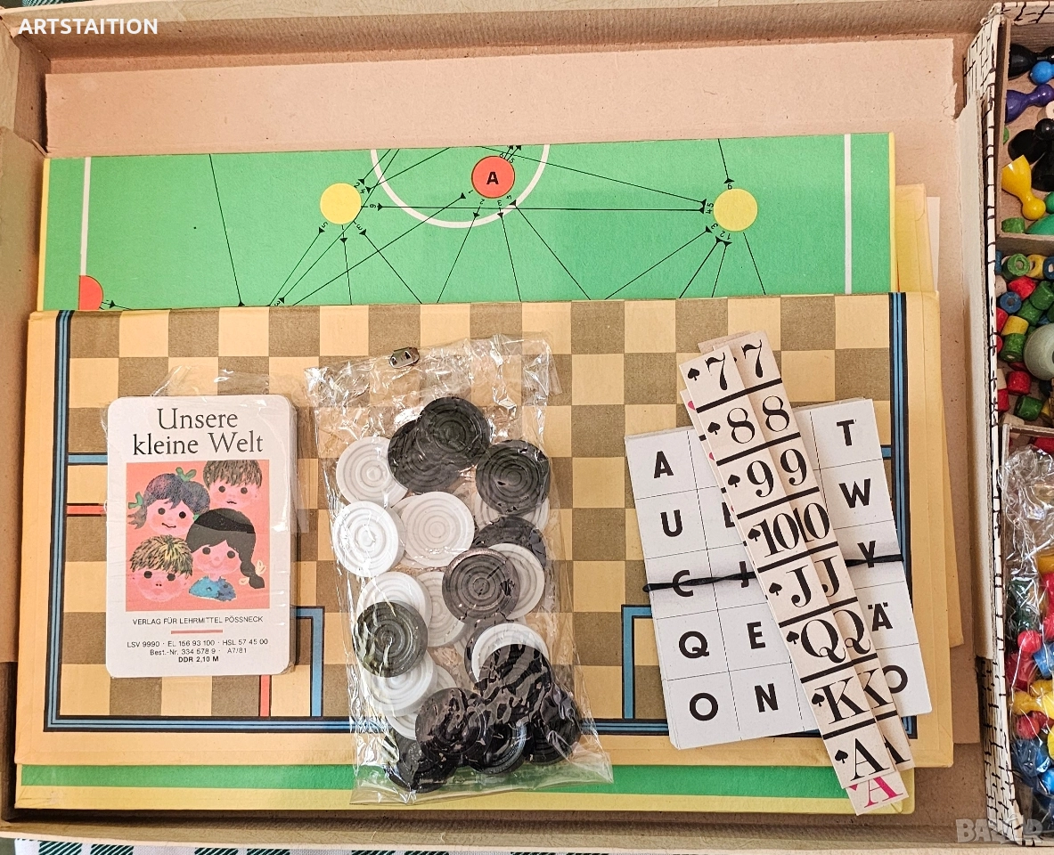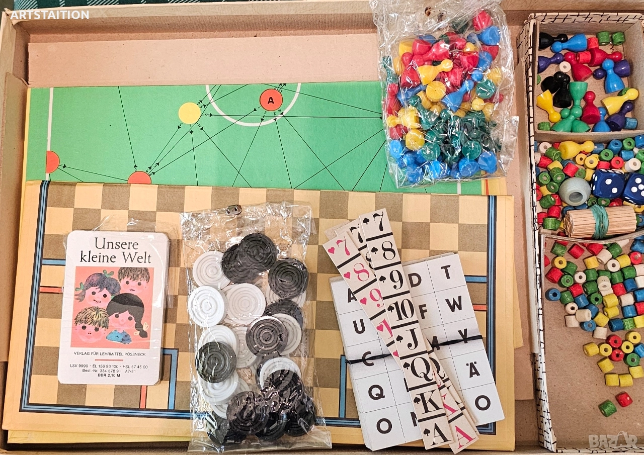 2.Винтидж колекция от настолни игри Spika ГДР съдържа ДЕСЕТ класически настолни игри в една кутия, включително шах, дама, „Не се сърди човече“, игри с думи, игра с коне, футболен мач. С различни игрални дъски, фигури, зарове и аксесоари, този комплект предлага разнообразно забавление за цялото семейство.