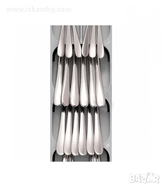 Компактен органайзер за прибори има изчистен дизайн в правоъгълна стеснена форма, разграфена на четири отделения за всички прибори - три големи и едно по-малко. По-малките са идеални за чаени лъжички и вилички.