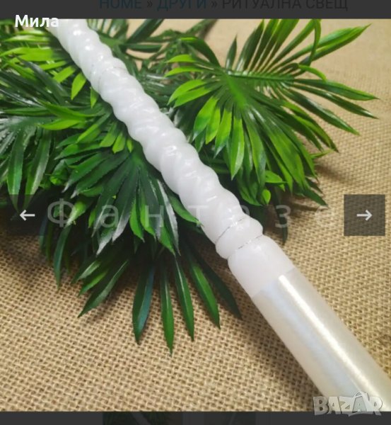 Ритуална свещ с височина 40 см, дебелина 2,5 см. Бяла със сребърна нишка. Цена 7.50 лв/бр.