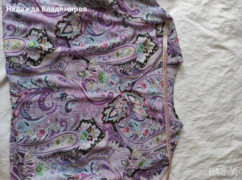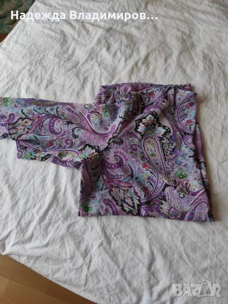 Продавам добре запазена копринена блуза с асиметрични ръкави,лилав десен.