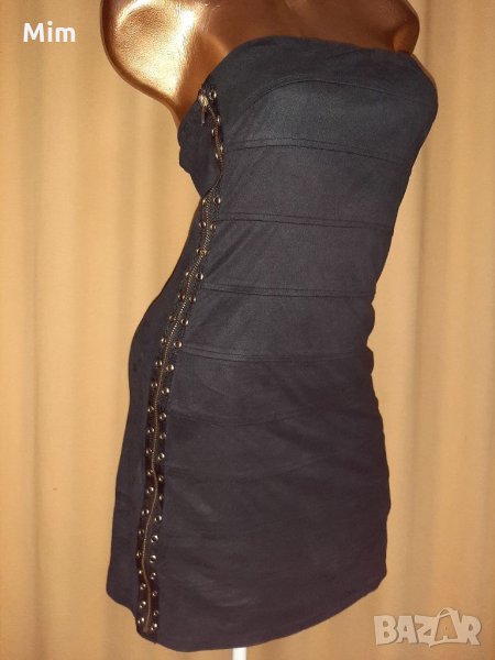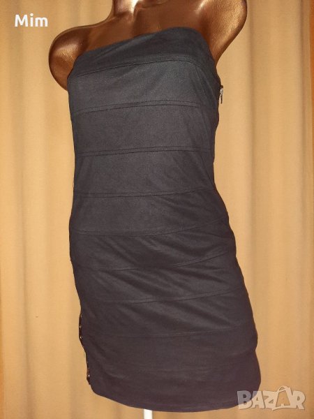 Черна къса рокля от тънък велур с подплата странично по цялата дължина е с капси и цип ,закопчаването е отзад с цип. Под мишниници 40 до 45 см едностранно талия 42 до 48 см едностранно, ханш 46 до 52 см едностранно дължина 62 см без презрамки със силиконова лента против преплъзване.