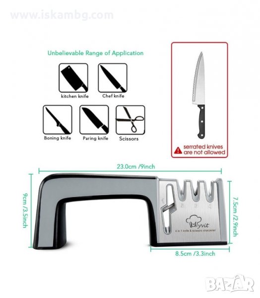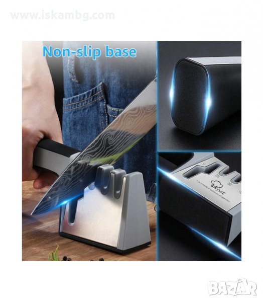 Универсално и професионално точило за ножове, ножици, сатъри. Основен и важен аксесоар за всяка кухня! Уникален и патентован компактен уред за заточване, който удължава живота на вашите ножове и ножици, като ги оставя силно заточени, като нови.