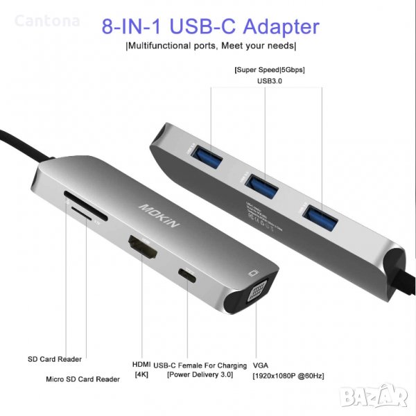 MOKiN USB Type-C Hub 8 в 1, 3xUSB 3.0, HDMI, VGA, /TF/SD четец на карти, PD - 100W