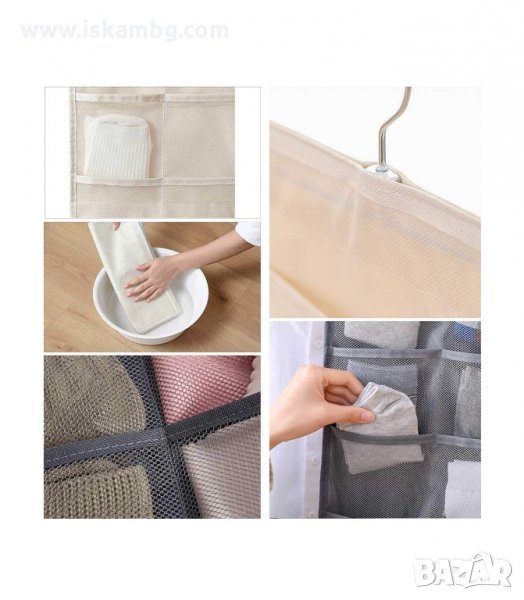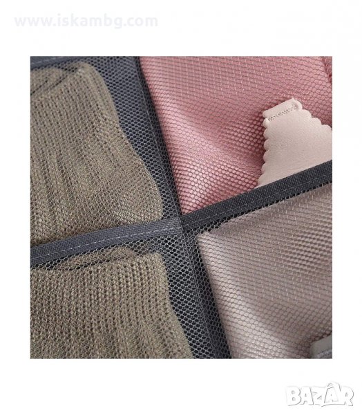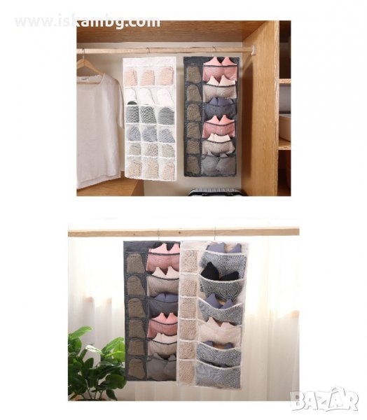 Текстилен органайзер за бельо, чорапи, сутиени и всякакви дребни аксесоари. Мултифункционален органайзер! Може да се използва и като органайзер за бижута. Органайзера е с две лица - предната част има 12 отделения, като едната колона е по-широка. Тя може да се използва за съхранение на сутиени. Задната част има 18 отделения, наистина побира много! Всички джобчета са мрежести за лесна видимост и проветрение. Органайзера има вградена закачалка, с която може да се закачи в гардероба или на друго място.