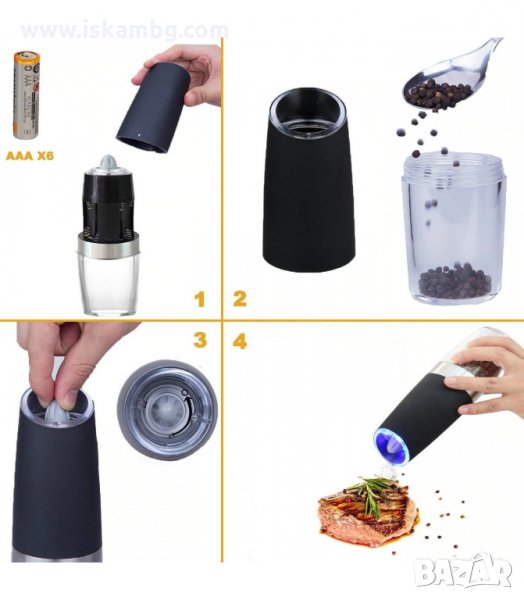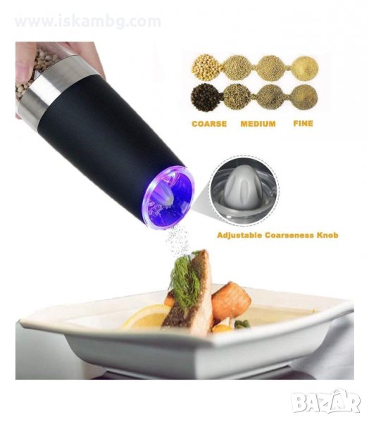 Мелница За сол, пипер и други подправки Автоматично се включва и изключва при наклон. С регулиращ се механизъм, според размера на зрънцата. изработена От устойчива пластмаса и кераминчи остриета. С LED светлина, която се включва когато мелницата работи.Захранвана от 6 ААА батерии