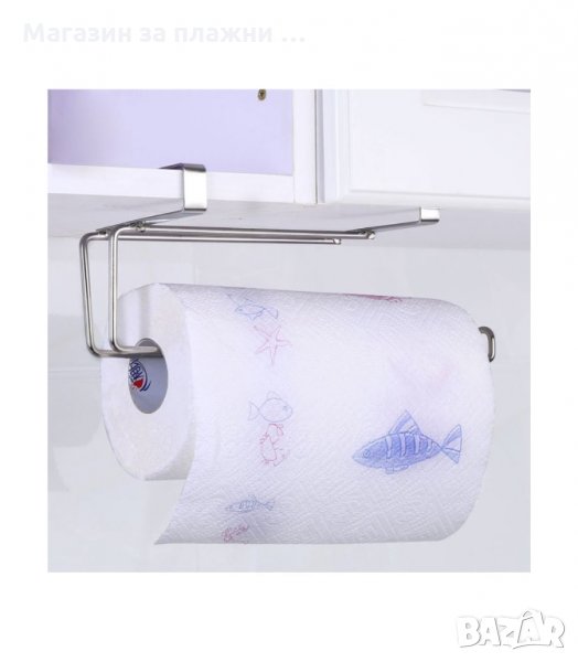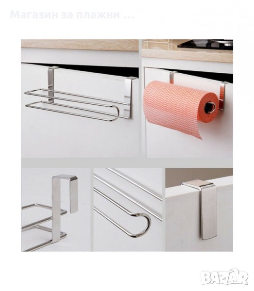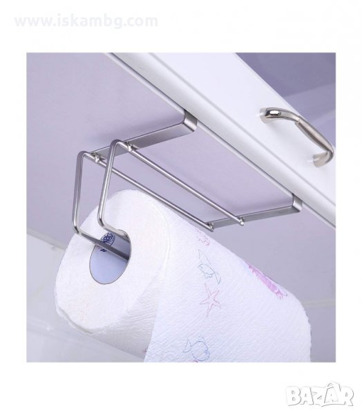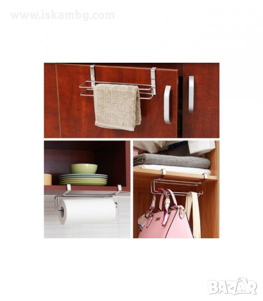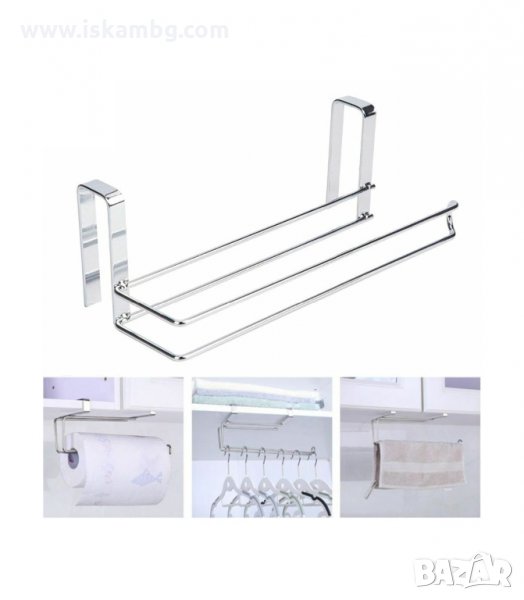 Метална поставка за кухненска хартия, която се закача за кухненска вратичка или шкаф. Практичен кухненски органайзер за кухненска хартия, кърпи или други кухненски принадлежности. Не са необходими инструменти за поставянето ѝ – просто я закачате за вратичката или шкафа и готово! Широко приложение – може да се използва и в гардероба, в банята и навсякъде, където може да се постави.
