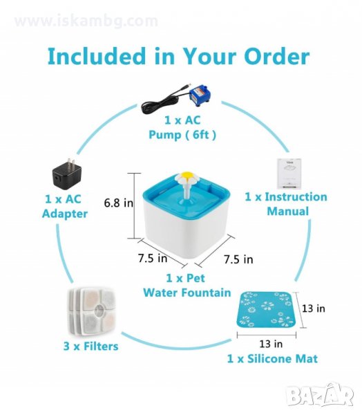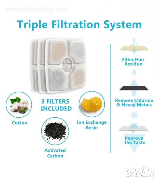 Фонтанът за пиене е не само красив, но удобната му височина го прави идеален за котенца и големи котки. Лесното разглобяване също прави почистването на кладенеца много лесно. Включва активен въглен (резервните филтри се продават отделно). Филтърът почиства и втвърдява водата от чешмата, докато филтрира утайките и примесите.
