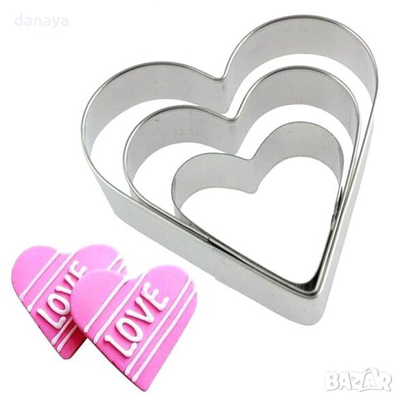 Комплект от 3 броя метални формички за сладки сърца. Метални резци за рязане на тесто и оформяне на дребни сладки курабии, меденки, бисквити и други сладкиши. Формичките са в комплект от 3 броя с форма на сърце, като трите сърца са с различен размер.