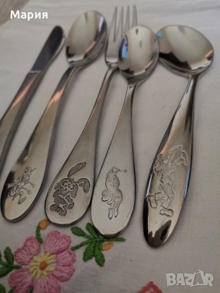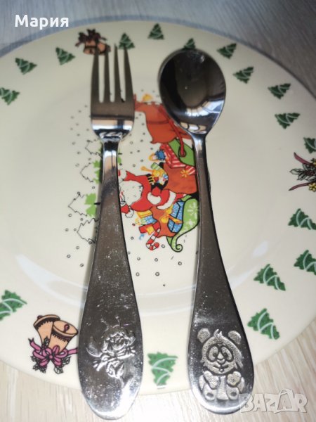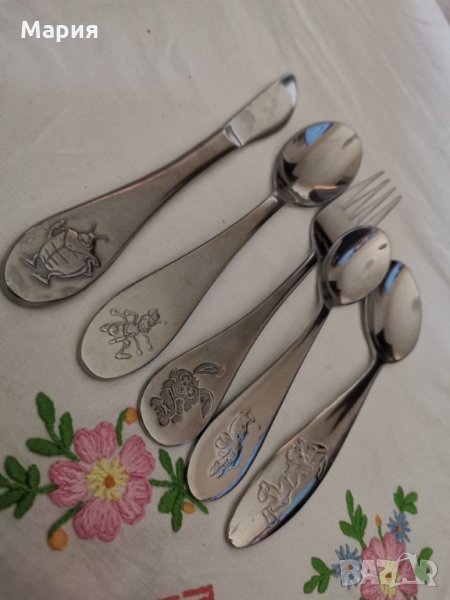 Прибори за хранене за дете, ергономични, удобни за хранене, заоблени ръбове за безопасна употреба, неръждаема стомана, маркировка. Сет от 5 броя прибора - вилица, лъжица, нож и два броя десертни лъжички цена 20лв.